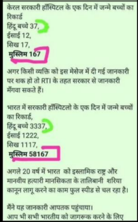 आगे वायरल मैसेज में दावा किया गया है कि भारत में सरकारी हॉस्पिटलों के एक दिन में 3337 हिंदू बच्चे, ईसाई 1222, सिख 1117 और 58167 मुस्लिम बच्चों ने जन्म लिया. साथ ही मैसेज में यह भी लिखा गया है कि “अगले 20 वर्ष में भारत को इस्लामिक राष्ट्र और मानवीय हत्यारी मानसिकता के तालिबानी शरिया कानून लागू करने का काम फुल स्पीड से चल रहा है”.