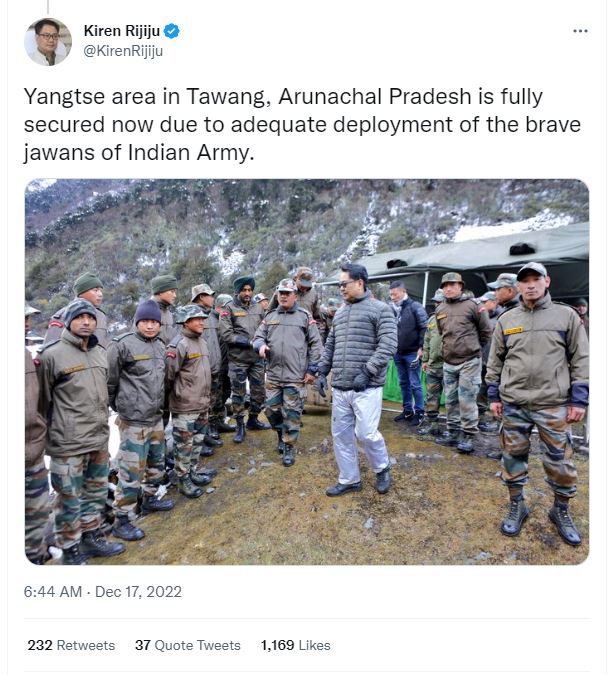 केंद्रीय कानून मंत्री किरण रिजिजू ने भारतीय जवानों के साथ अपनी एक तस्वीर शेयर कर बताया कि अरुणाचल प्रदेश के तवांग सेक्टर का यांगस्ते इलाका पूरी तरह से सुरक्षित है।