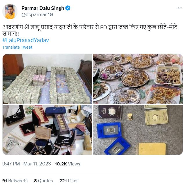 सोशल मीडिया पर कई तस्वीरों का एक कोलाज शेयर कर दावा किया जा रहा है कि ये लालू प्रसाद यादव के घर हुई छापेमारी की तस्वीरें हैं। इन तस्वीरों में महंगे आभूषण, धन और कुछ डॉक्यूमेंट नज़र आ रहे हैं।
