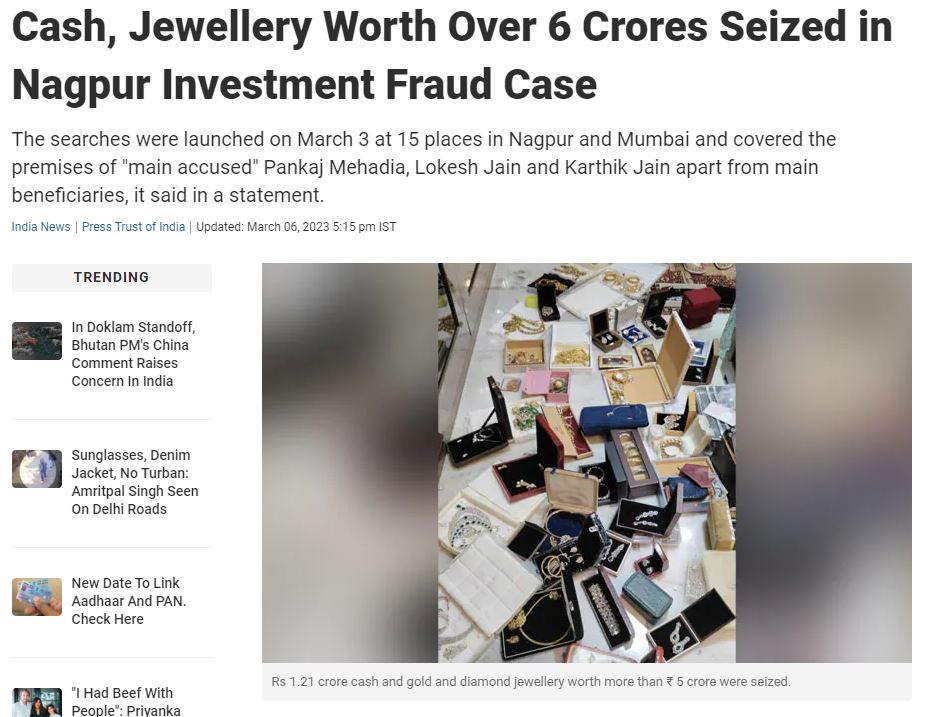 इसके अलावा ये दोनों तस्वीरें ईडी द्वारा तीन मार्च को किए गए एक ट्वीट में भी मौजूद हैं। इसमें लिखे कैप्शन के अनुसार, ईडी ने मामले में मुख्य आरोपी पंकज मेहदिया, लोकेश जैन और कार्तिक जैन के नागपुर और मुंबई स्थित ठिकानों पर छापेमारी कर यह सामान जब्त किए हैं।