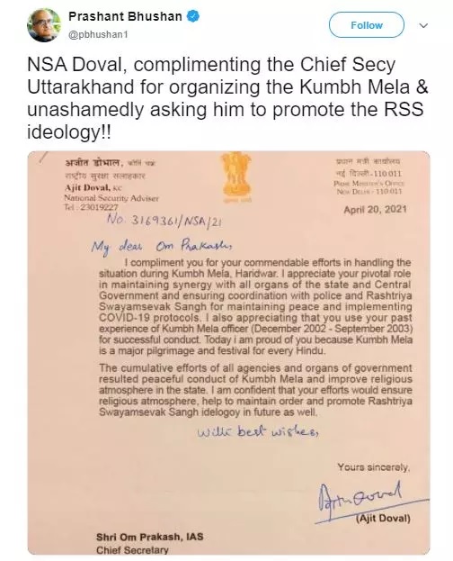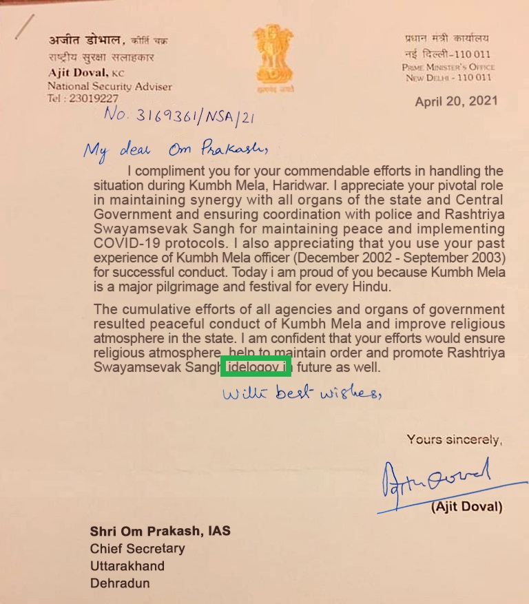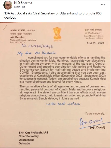 साथ ही यह भी कह रहे हैं कि मुख्य सचिव और सभी अधिकारियों के ये सभी प्रयास संघ की विचारधारा को आगे बढ़ाने में मदद करेगें। सभी अधिकारियों ने कुंभ की परिस्थितियों को काफी अच्छे से संभाला है। इस पत्र को शेयर करते हुए दावा किया जा रहा है कि देश का राष्ट्रीय सुरक्षा सलाहकार, एक आईएएस अधिकारी से RSS की विचारधारा को बढ़ावा देने के लिए कह रहा है।