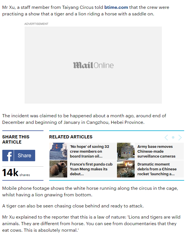 The Sun के UK प्रकाशन द्वारा 15 जनवरी, 2018 को प्रकाशित एक लेख के अनुसार यह वीडियो चीन के Hebei Province (प्रांत) के Cangzhou शहर का है, जहां Taiyang सर्कस द्वारा आयोजित पूर्वाभ्यास (रिहर्सल) के दौरान एक शेर तथा बाघ ने घोड़े पर हमला कर दिया था. Daily Mail द्वारा 15 जनवरी, 2018 को प्रकाशित लेख में भी वीडियो को चीन के Hebei Province (प्रांत) के Cangzhou शहर का बताया गया है.