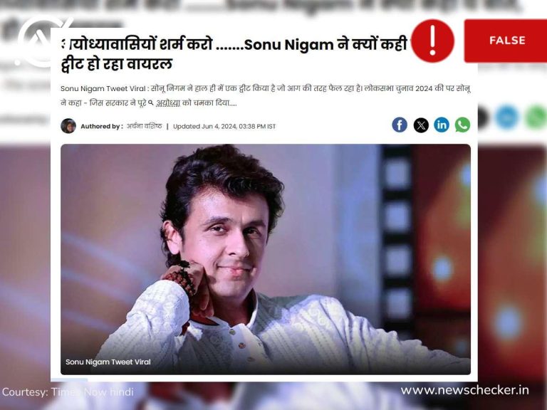 सोशल मीडिया यूजर्स ने दावा किया कि गायक सोनू निगम ने लोकसभा चुनाव नतीजों के दिन ट्वीट के जरिए अयोध्यावासियों की आलोचना की है। हमारी पड़ताल में ये दावा फर्जी साबित हुआ। फैक्ट चेक यहां पढ़ें।