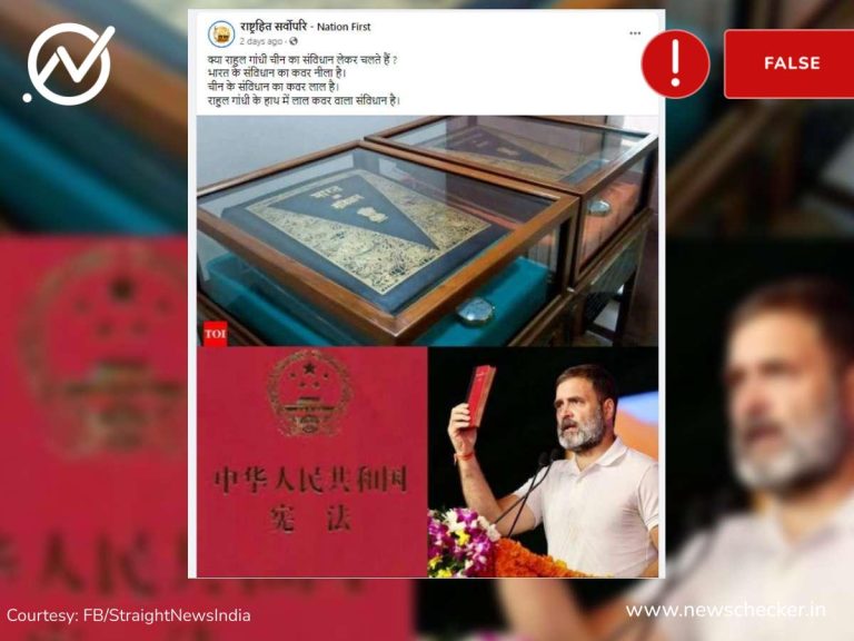 सोशल मीडिया यूजर्स ने दावा किया कि राहुल गांधी अपने कार्यक्रमों में चीन का संविधान लेकर जाते हैं। हमारी जांच में ये दावा फर्जी साबित हुआ। फैक्ट चेक यहां पढ़ें।