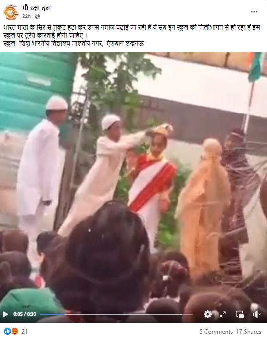 सोशल मीडिया पर लखनऊ के एक स्कूल में हुए नाटक मंचन का एक वीडियो वायरल है। वीडियो में भारत माता का पोशाक पहनी हुई एक बच्ची नज़र आ रही है, जिसके सिर पर से कुछ बच्चे भारत माता का मुकुट उतारकर उस पर सफेद कपड़ा बांधते नज़र आ रहे हैं। इसके बाद मंच पर खड़े कुछ बच्चे नमाज़ पढ़ते हुए देखे जा सकते हैं। इस वीडियो को कई सोशल मीडिया यूजर्स सांप्रदायिक दावे के साथ शेयर कर रहे हैं।