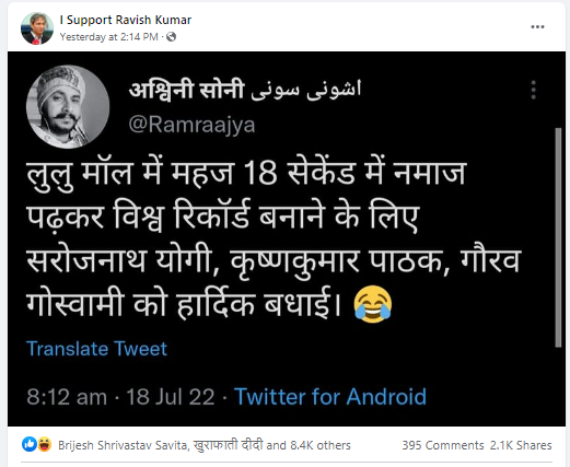 सोशल मीडिया पर एक पोस्ट शेयर कर दावा किया जा रहा है कि लखनऊ के लुलु मॉल में हिंदुओं ने नमाज़ पढ़ी थी और पुलिस ने उन्हें गिरफ्तार कर लिया। कहा जा रहा है कि यूपी पुलिस ने नमाज़ पढ़ने के आरोप में सरोज नाथ योगी, कृष्ण कुमार पाठक और गौरव गोस्वामी को गिरफ्तार कर लिया है। यूजर्स दावा कर रहे हैं कि इन युवकों ने नमाज़ पढ़कर साम्प्रदायिक सौहार्द बिगाड़ा था।