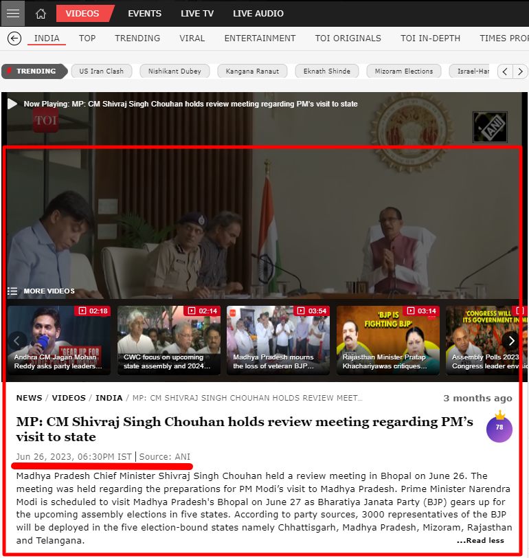 The Times of India द्वारा 26 जून, 2023 को प्रकाशित लेख के अनुसार, यह वीडियो शिवराज सिंह चौहान द्वारा प्रधानमंत्री नरेंद्र मोदी के भोपाल दौरे की तैयारियों का जायजा लेने के लिए बुलाई गई समीखा बैठक का है. इसके अतिरिक्त, Zee News द्वारा 26 जून 2023 को प्रकाशित लेख में वायरल वीडियो मौजूद है.