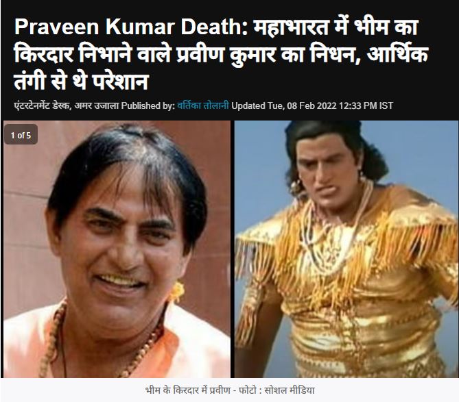 दावे की सत्यता जानने के लिए हमने ‘महाभारत प्रवीण निधन’ कीवर्ड को गूगल सर्च किया। हमें अमर उजाला द्वारा 8 फरवरी 2022 को प्रकाशित एक रिपोर्ट मिली। रिपोर्ट के अनुसार, महाभारत सीरियल में भीम का किरदार निभाने वाले अभिनेता प्रवीण कुमार सोबती का 74 वर्ष की आयु में निधन हो गया। रिपोर्ट के अनुसार, प्रवीण कुमार लंबे समय से आर्थिक तंगी और बीमारी से जूझ रहे थे।