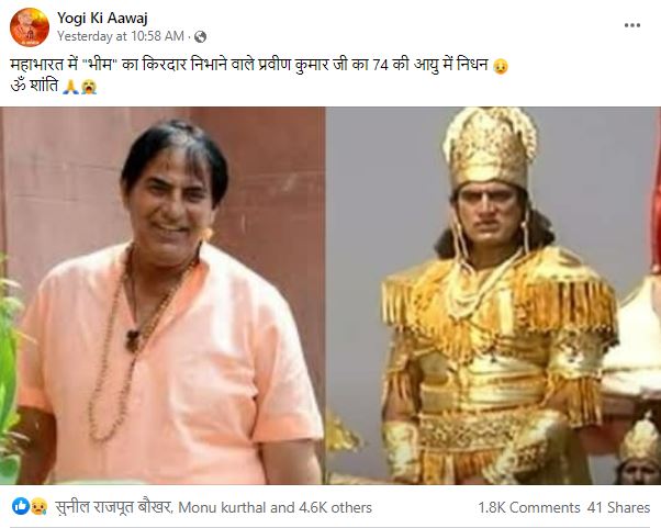 सोशल मीडिया पर एक पोस्ट शेयर कर दावा किया जा रहा है कि ‘महाभारत’ सीरियल में भीम का किरदार निभाने वाले प्रवीण कुमार का 74 वर्ष की आयु में निधन हो गया।