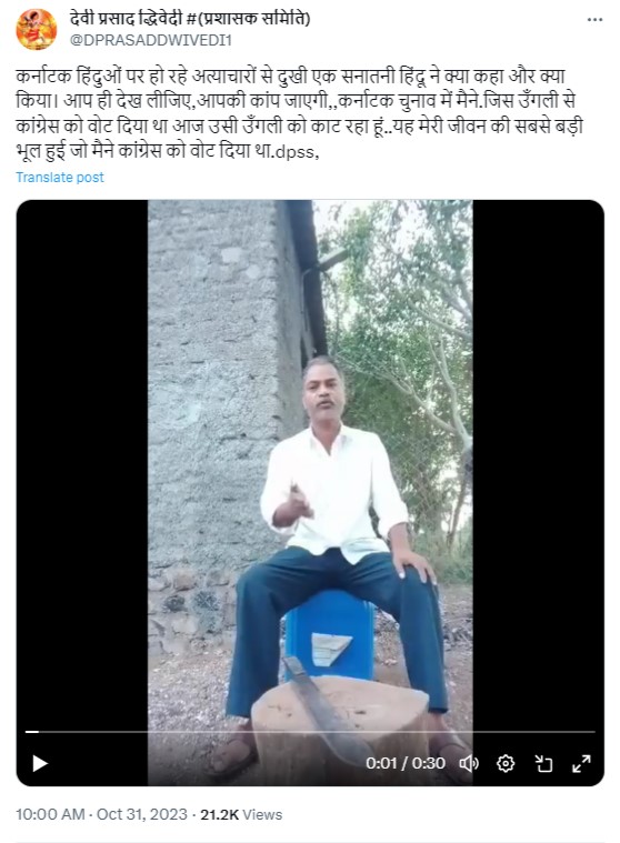 वीडियो को वायरल दावे के साथ एक्स (पूर्व में ट्विटर) पर शेयर करते हुए कैप्शन में लिखा गया है, “कर्नाटक हिंदुओं पर हो रहे अत्याचारों से दुखी एक सनातनी हिंदू ने क्या कहा और क्या किया। आप ही देख लीजिए,आपकी कांप जाएगी,,कर्नाटक चुनाव में मैने.जिस उँगली से कांग्रेस को वोट दिया था आज उसी उँगली को काट रहा हूं..यह मेरी जीवन की सबसे बड़ी भूल हुई जो मैने कांग्रेस को वोट दिया था”.