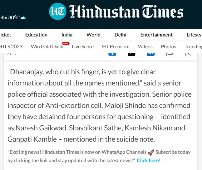19 अगस्त, 2023 को हिंदुस्तान टाइम्स की वेबसाइट पर प्रकाशित रिपोर्ट में एंटी-एक्सटॉरशन सेल के सीनियर पुलिस इंस्पेक्टर मालोजी शिंदे का बयान भी शामिल है. इंस्पेक्टर मालोजी शिंदे के अनुसार, रिपोर्ट लिखे जाने तक इस मामले में चार व्यक्तियों नरेश गायकवाड़, शशिकांत साठे, कमलेश निकम और गणपति काम्बले को गिरफ्तार किया गया था.