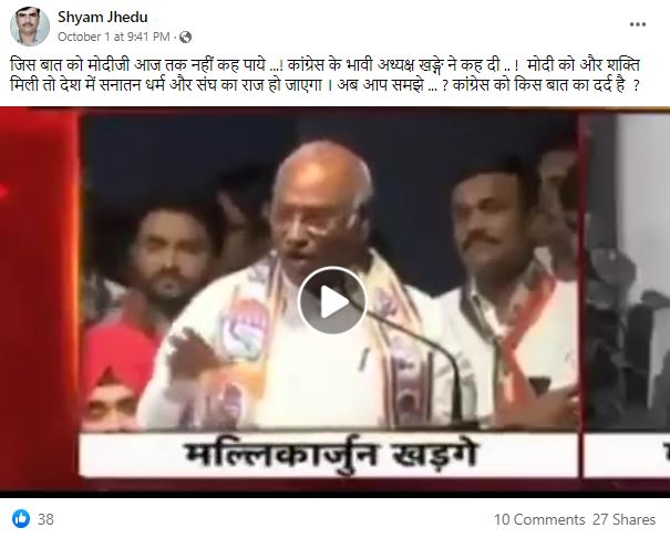 सोशल मीडिया पर कांग्रेस अध्यक्ष पद के उम्मीदवार मल्लिकार्जुन खड़गे का एक वीडियो वायरल है। इस वीडियो में वह कह रहे हैं कि यदि नरेंद्र मोदी को और शक्ति मिली तो देश में आरएसएस और सनातन धर्म की हुकूमत आ जाएगी। उनके इस वीडियो को हालिया दिनों का बताकर शेयर किया जा रहा है।