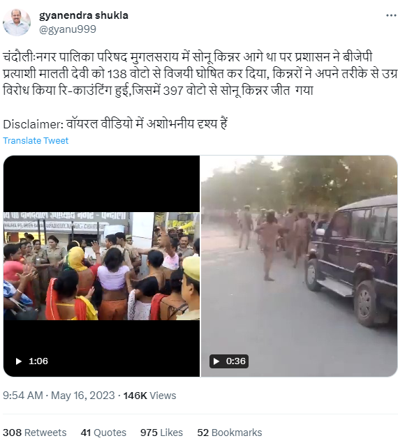 मणिपुर में नग्न महिलाओं की टीम द्वारा पुलिस को खदेड़ कर विरोध करने के नाम पर शेयर किए जा रहे इस वीडियो की पड़ताल के लिए हमने इसके एक की-फ्रेम को गूगल पर ढूंढा. सर्च प्रक्रिया से प्राप्त परिणामों से हमें यह जानकारी मिली कि वीडियो साल 2023 के मई माह में उत्तर प्रदेश में हुए निकाय चुनावों का है. पत्रकार ज्ञानेंद्र शुक्ला द्वारा शेयर किए गए ट्वीट के अनुसार, यह वीडियो चंदौली जिले के मुगलसराय नगर पालिका परिषद के लिए हुए चुनावों का है, जहां सोनू किन्नर नामक प्रत्याशी के साथ हुई धांधली के विरोध में किन्नर समाज के लोगों ने नग्न होकर प्रदर्शन किया था. (चेतावनी: वीडियो में नग्नता के दृश्य हैं.)