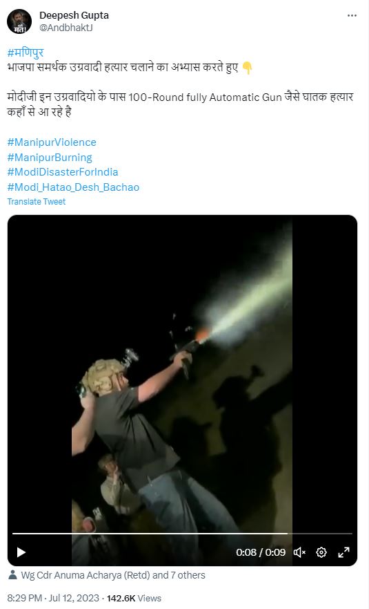 सोशल मीडिया पर एक वीडियो वायरल है, जिसमें एक व्यक्ति बंदूक चलाते हुए नज़र आ रहा है। वीडियो को शेयर कर दावा किया जा रहा है कि यह मणिपुर का है जहां भाजपा समर्थित उग्रवादी हथियार चलाने का अभ्यास कर रहे हैं।