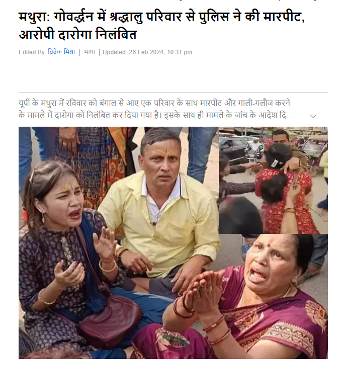 दैनिक भास्कर की रिपोर्ट में दी गई जानकारी के अनुसार, यह मामला बीते 25 फरवरी का है. पश्चिम बंगाल के कोलकाता से राजेश पांडे का परिवार मथुरा में ब्रज दर्शन के लिए आया था. रविवार शाम को राजेश पांडे बरसाना से दर्शन करके गोवर्धन आ रहे थे, तभी डीग अड्डे पर लगी बैरियर से उनकी गाड़ी आगे निकल गई. जिसके बाद वहां तैनात पुलिसकर्मी ने गाड़ी के ड्राइवर और उसमें बैठे श्रद्धालुओं को बुरा भला कहा. जिसके चलते राजेश पांडे के परिवार वाले और पुलिसकर्मियों में बहस हो गई.