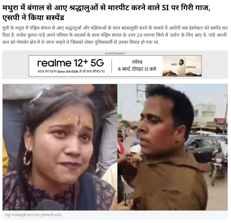इसके अलावा, हमें आजतक की वेबसाइट पर प्रकाशित रिपोर्ट मिली. इस रिपोर्ट में भी इस घटना को मथुरा का ही बताते हुए लिखा गया गया है कि पश्चिम बंगाल से आए श्रद्धालुओं के साथ बदसलूकी करने के आरोप में एसएसपी शैलेश कुमार पांडे ने सब इंस्पेक्टर राजकुमार को निलंबित कर दिया है.