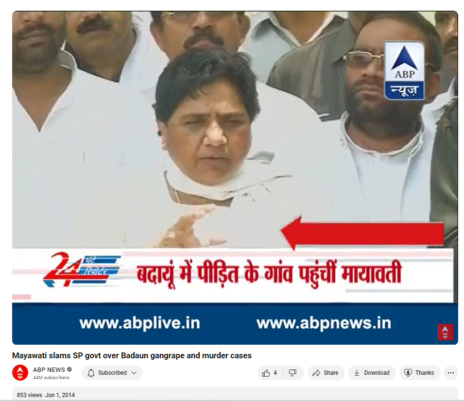 खोजने पर हमें एबीपी न्यूज के आधिकारिक यूट्यूब चैनल से भी 1 जून 2014 को अपलोड किया गया वीडियो मिला. इस वीडियो में भी वायरल वीडियो वाले दृश्य मौजूद थे. वीडियो में दी गई जानकारी के अनुसार, पूर्व मुख्यमंत्री मायावती ने बदायूं में दो नाबालिग लड़कियों के साथ गैंगरेप की हत्या के बाद पीड़ित परिवारों से मुलाक़ात की थी.