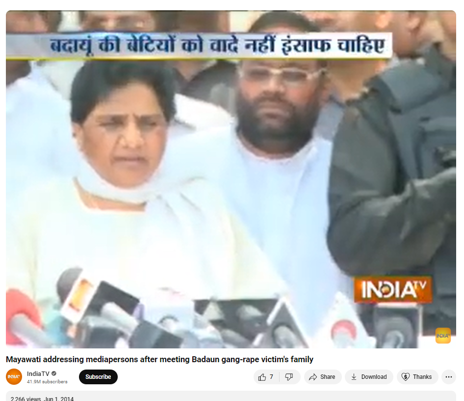 इसलिए हमने अपनी जांच को आगे बढ़ाते हुए संबंधित कीवर्ड की मदद से गूगल सर्च किया. इस दौरान हमें इंडिया टीवी के यूट्यूब अकाउंट से 1 जून 2014 को अपलोड किया गया वीडियो मिला. वीडियो के साथ मौजूद टाइटल में बताया गया था कि “मायावती ने बदायूं गैंगरेप पीड़ितों के परिवार वालों से मिलने के बाद मीडियाकर्मियों को संबोधित किया. इस वीडियो में वायरल वीडियो वाले दृश्य शामिल हैं.