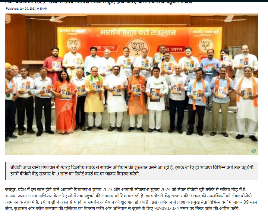 सामान नागरिक संहिता को लेकर वायरल हुए इस दावे की जांच के लिए हमने कुछ कीवर्ड्स की मदद से गूगल सर्च किया। इस दौरान हमें ईटीवी भारत द्वारा 10 जून को प्रकाशित एक रिपोर्ट मिली। इस रिपोर्ट में बताया गया है कि बीजेपी ने अपने 9 साल पूरे होने पर एक नंबर जारी कर ‘जनसंपर्क से जन समर्थन’ अभियान शुरू किया है।’ इस पहल का उद्देश्य पार्टी के समर्थन आधार को बढ़ाना और 2019 में पार्टी द्वारा चलाए गए सदस्यता अभियान को याद कराना है। बतौर रिपोर्ट, बीजेपी के केंद्र में 9 साल पूरे होने पर गरीब कल्याण सहित कई योजनाओं को लेकर बीजेपी के नेता जनता के बीच जायेंगे और उनसे 9090902024 पर कॉल करके पार्टी के अभियान से जुड़ने का आग्रह करेंगे।