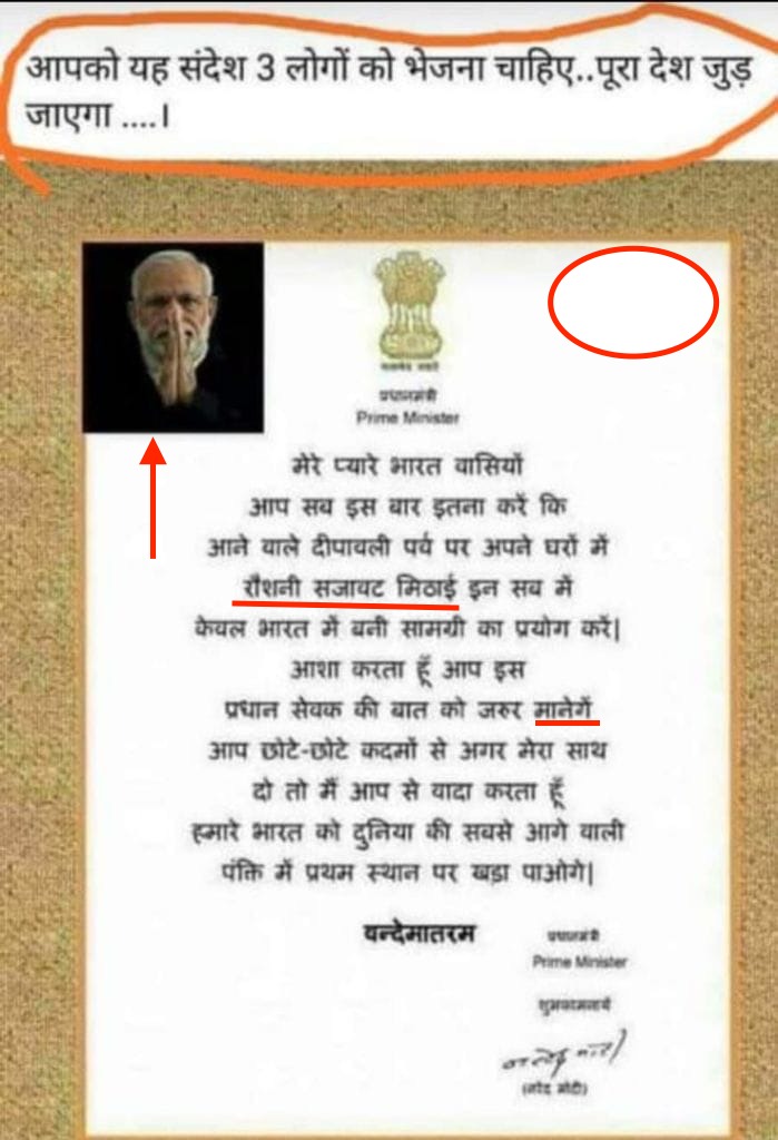 दीपावली, हिंदुओं के सबसे प्रमुख और बड़े त्योहारों में से एक है। इस वर्ष दीपावली का त्यौहार 4 नवंबर 2021 को है। इसी बीच फेसबुक पर प्रधानमंत्री नरेंद्र मोदी के नाम से एक पत्र का स्क्रीनशॉट वायरल हो रहा है, जिसमें वो लोगों से अपील कर रहे हैं कि इस वर्ष दीपावली पर केवल भारत में बने उत्पादनों को ही खरीदें। वायरल पत्र में पीएम मोदी के हस्ताक्षर भी हैं।