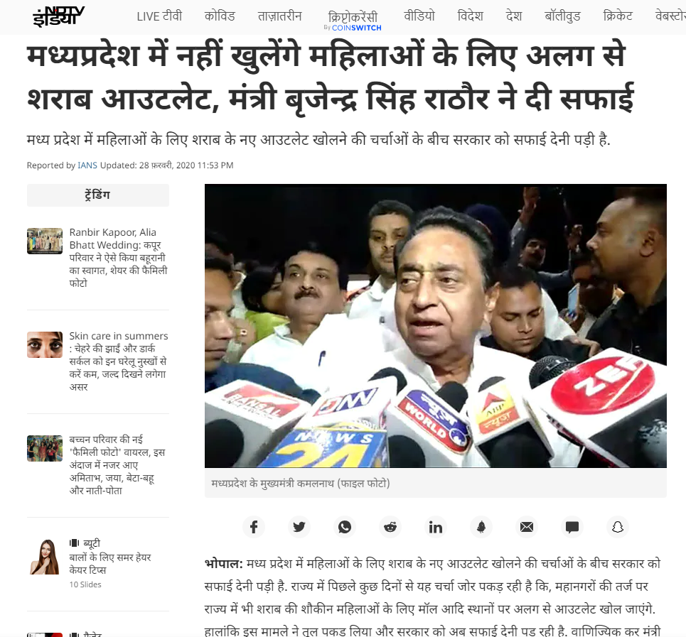 इसके अलावा हमने ‘मध्य प्रदेश महिलाएं शराब दुकान’ कीवर्ड की मदद से गूगल पर सर्च करना शुरू किया। इस दौरान हमें नवभारत टाइम्स द्वारा 27 फरवरी, 2020 को प्रकाशित एक रिपोर्ट प्राप्त हुई। रिपोर्ट के अनुसार, मध्य प्रदेश के तत्कालीन मुख्यमंत्री कमलनाथ ने राज्य में महिलाओं के लिए अलग से शराब की दुकानों को खोलने का फैसला लिया था। बतौर रिपोर्ट, इसकी शुरुआत भोपाल, इंदौर, जबलपुर और ग्वालियर में एक-एक दुकान खोलकर की जाएगी।