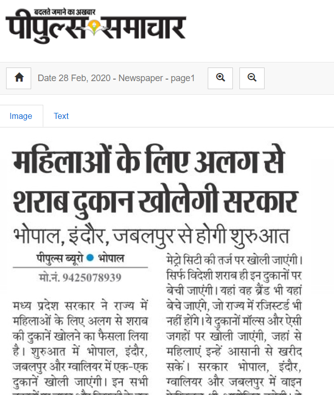 क्या मध्य प्रदेश सरकार महिलाओं के लिए अलग से शराब की दुकानें खोलने जा रही है? सोशल मीडिया पर वायरल हुए इस दावे की पड़ताल लिए हमने अखबार की कटिंग को ध्यान से देखा। देखने पर पता चलता है कि यह कटिंग किसी पीपुल समाचार पत्र से ली गई है। हमने ‘पीपुल्स समाचार’ के ई-पेपर पर इस खबर को सर्च करना शुरू किया। इस दौरान हमें ‘पीपुल्स समाचार’ द्वारा 27 फरवरी, 2020 को जबलपुर संस्करण में प्रकाशित एक रिपोर्ट प्राप्त हुई। रिपोर्ट में वायरल खबर संलग्न है।