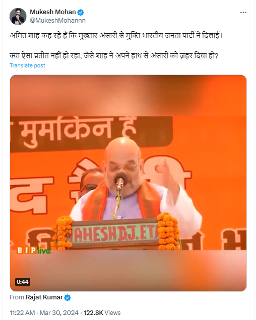 इस वीडियो को वेरिफाईड एक्स अकाउंट से शेयर करते हुए कैप्शन में लिखा गया है, “अमित शाह कह रहे हैं कि मुख्तार अंसारी से मुक्ति भारतीय जनता पार्टी ने दिलाई। क्या ऐसा प्रतीत नहीं हो रहा, जैसे शाह ने अपने हाथ से अंसारी को ज़हर दिया हो?”
