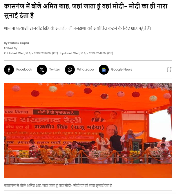 जांच में हमें अमर उजाला की वेबसाइट पर 10 अप्रैल 2019 को प्रकाशित रिपोर्ट मिली. इस रिपोर्ट में भी बताया गया था कि लोकसभा चुनाव 2019 के दौरान कासगंज में आयोजित विजय शंखनाद रैली में उन्होंने कहा कि “भारतीय जनता पार्टी की सरकार ने निजाम से मुक्ति दिलाई है”.