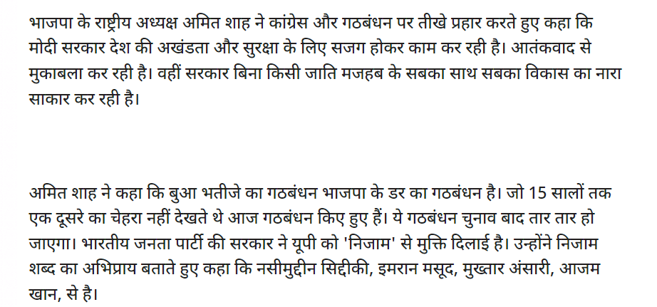 वायरल वीडियो 57 सेकेंड का है. इस वीडियो में अमित शाह यह कहते हुए नज़र आ रहे हैं कि, “सबसे बड़ा काम हमने किया है कि हमने निजाम से मुक्ति दिलाई है”. आगे अमित शाह कहते हैं, “निजाम(NIZAAM) में N से मतलब नसीमुद्दीन सिद्दीकी से मुक्ति भारतीय जनता पार्टी ने दिलाई. I से मतलब इमरान मसूद से मुक्ति भारतीय जनता पार्टी ने दिलाई. आजम खान से मुक्ति भारतीय जनता पार्टी ने दिलाई. अतीक अहमद से मुक्ति भारतीय जनता पार्टी ने दिलाई और मुख्तार अंसारी से मुक्ति भी भारतीय जनता पार्टी ने दिलाई है. अगर सपा-बसपा गठबंधन आया तो यूपी में फिर से (NIZAAM) का शासन आ जाएगा”.