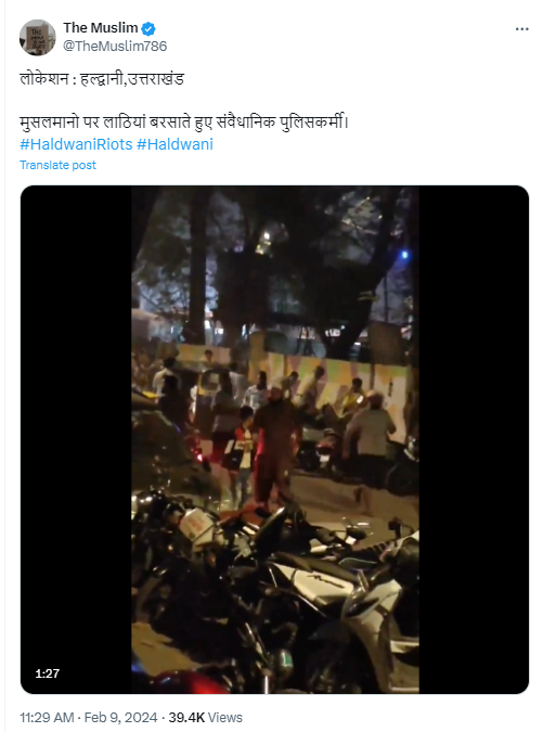 वीडियो को सोशल मीडिया प्लेटफार्म X पर वायरल दावे वाले कैप्शन के साथ शेयर किया गया है, जिसमें लिखा हुआ है, “लोकेशन : हल्द्वानी,उत्तराखंड. मुसलमानो पर लाठियां बरसाते हुए संवैधानिक पुलिसकर्मी”.