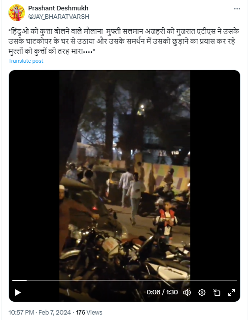 हालांकि, हमने अपनी जांच में पाया कि यह वीडियो ग्रेटर मुंबई के घाटकोपर पुलिस स्टेशन के पास का है, जहां 4 फ़रवरी 2024 को इस्लामिक उपदेशक मुफ़्ती सलमान अजहरी की गिरफ़्तारी के बाद थाने पर जमी भीड़ को तितर बितर करने के लिए पुलिस ने लाठीचार्ज किया था.