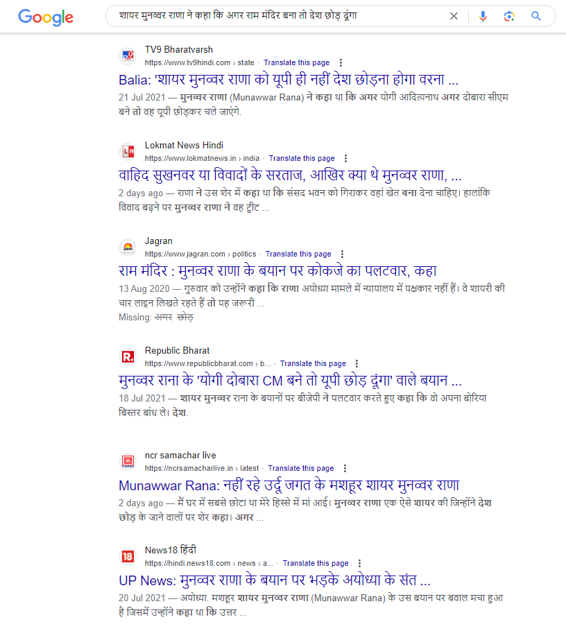 दिवंगत शायर मुनव्वर राणा द्वारा राम मंदिर बनने पर देश छोड़ने की बात कहे जाने के नाम पर शेयर किए जा रहे इस दावे की पड़ताल के लिए हमने ‘शायर मुनव्वर राणा ने कहा कि अगर राम मंदिर बना तो देश छोड़ दूंगा’ कीवर्ड्स को गूगल पर ढूंढा. इस प्रक्रिया में हमें ऐसी कोई मीडिया रिपोर्ट प्राप्त नहीं हुई, जिससे इस बात की पुष्टि हो सके कि उन्होंने राम मंदिर के निर्माण को लेकर देश छोड़ने की बात कही थी. गौरतलब है कि साल 2021 के जुलाई माह में प्रकाशित कई मीडिया रिपोर्ट्स में इस बात का उल्लेख है कि मुनव्वर राणा ने यह बयान दिया था कि अगर योगी आदित्यनाथ दुबारा उत्तर प्रदेश के मुख्यमंत्री बनते हैं तो वह प्रदेश छोड़ देंगे.