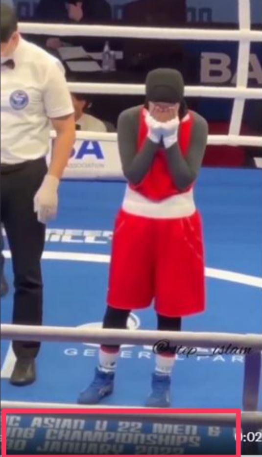 सोशल मीडिया पर एक वीडियो शेयर कर दावा किया गया है कि एक मुस्लिम महिला बॉक्सर ने अपने धार्मिक संस्कारों की वजह से रेफरी को अपना हाथ नहींं पकड़ने दिया।