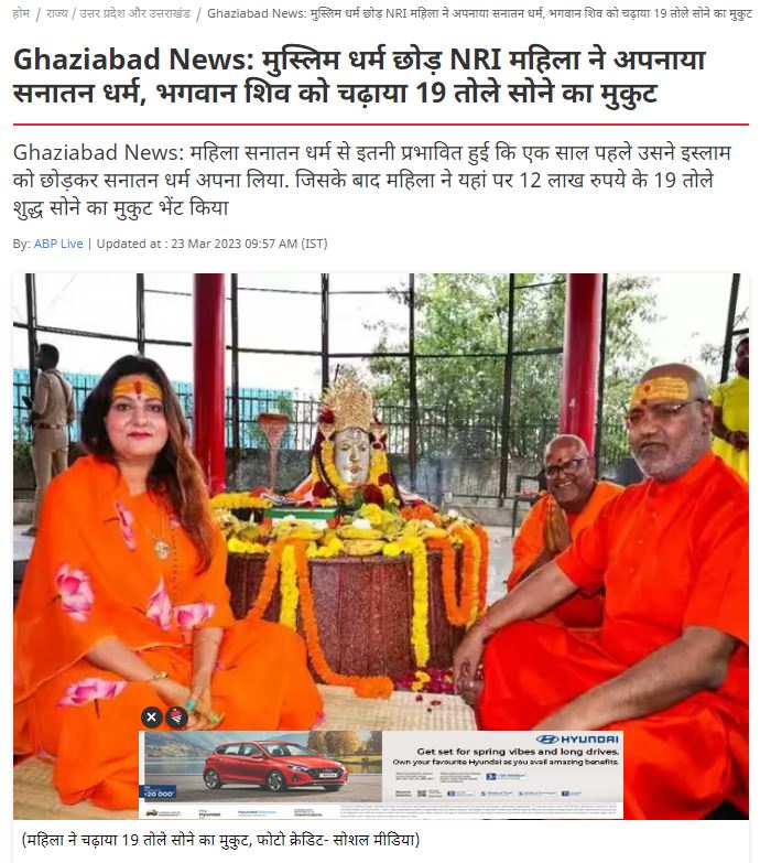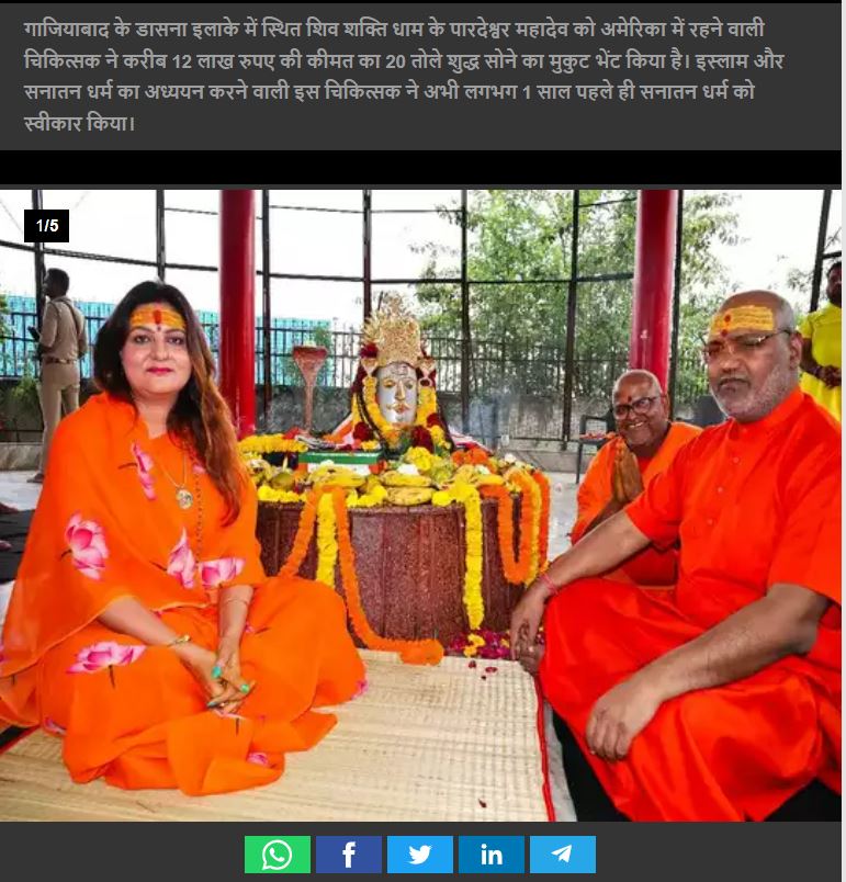 सोशल मीडिया पर एक पोस्ट शेयर कर दावा किया जा रहा है कि यूपी में एक महिला ने भगवान शिव को 19 तोले सोने का मुकुट अर्पित किया। साथ ही कहा जा रहा है कि उस महिला ने मुस्लिम धर्म से सनातन धर्म को अपनाया है। पोस्ट के साथ एक तस्वीर वायरल हो रही है, जिसमें यति नरसिंहानंद के साथ एक महिला बैठी नज़र आ रही हैं।