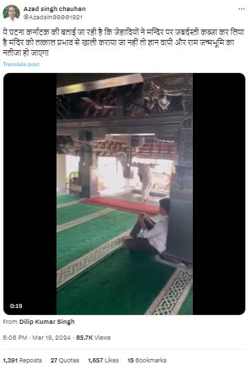 पोस्ट के कैप्शन में लिखा गया है कि “ये घटना कर्नाटक की बताई जा रही है कि जेहादियों ने मन्दिर पर जबर्दस्ती कब्जा कर लिया है मंदिर को तत्काल प्रभाव से खाली कराया जाये नहीं तो ज्ञान वापी और राम जन्मभूमि का नतीजा हो जाएगा”