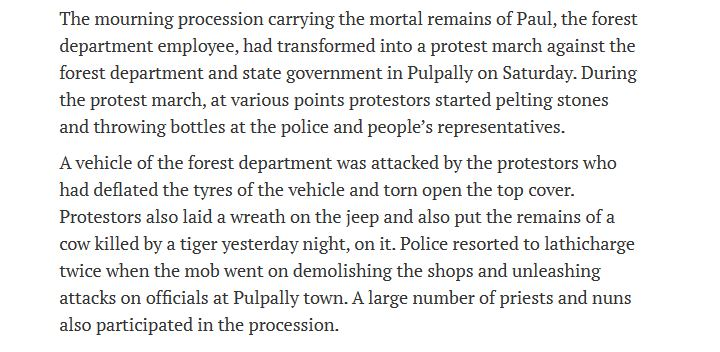 17 फरवरी, 2024 को मनोरमा द्वारा प्रकाशित रिपोर्ट में भी इस बात की पुष्टि होती है कि पुलपल्ली शहर में मानव-वन्यजीव संघर्ष के विरोध में बाघ द्वारा मारी गई गाय को वन विभाग की जीप पर बांध दिया गया था।