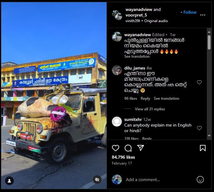 सोशल मीडिया पर वायरल हो रहे इस वीडियो की पड़ताल के लिए सबसे पहले हमने वीडियो के की-फ्रेम्स को रिवर्स इमेज सर्च किया। इस दौरान यह वीडियो हमें इंस्टाग्राम पर @wayanadview नाम के अकाउंट पर मिला। मलयालम में लिखे पोस्ट के कैप्शन में कहा गया है ‘जब पुलपल्ली में लोगों ने कानून अपने हाथ में ले लिया’ (अनुवादित)।