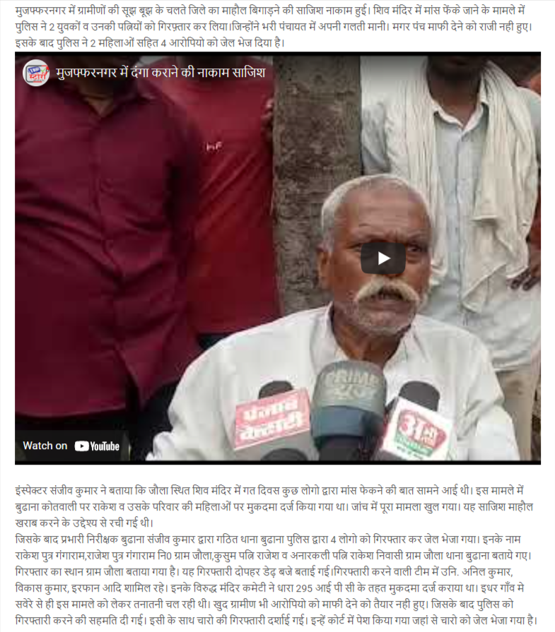वायरल खबर के बारे में अधिक जानकारी के लिए हमने कुछ कीवर्ड्स की सहायता से एक बार फिर गूगल सर्च किया. इस प्रक्रिया में हमें True स्टोरी नामक एक न्यूज़ पोर्टल पर वायरल खबर को लेकर प्रकाशित एक रिपोर्ट प्राप्त हुई. उक्त लेख के मुताबिक, “मुजफ्फरनगर में ग्रामीणों की सूझबूझ के चलते जिले का माहौल बिगाड़ने की साजिश नाकाम हुई। शिव मंदिर में मांस फेंके जाने के मामले में पुलिस ने 2 युवकों व उनकी पत्नियों को गिरफ़्तार कर लिया, जिन्होंने भरी पंचायत में अपनी गलती मानी। मगर पंच माफी देने को राजी नहीं हुए। इसके बाद पुलिस ने 2 महिलाओं सहित 4 आरोपियों को जेल भेज दिया है। इंस्पेक्टर संजीव कुमार ने बताया कि जौला स्थित शिव मंदिर में गत दिवस कुछ लोगों द्वारा मांस फेकने की बात सामने आई थी। इस मामले में बुढाना कोतवाली में राकेश व उसके परिवार की महिलाओं पर मुकदमा दर्ज किया गया था। जांच में पूरा मामला खुल गया। यह साजिश माहौल खराब करने के उद्देश्य से रची गई थी।”