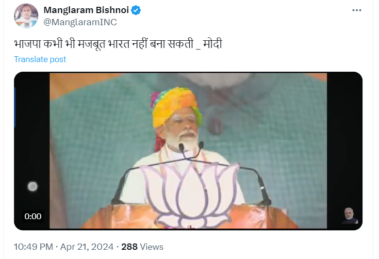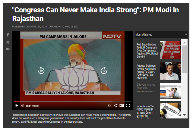 21 अप्रैल 2024 को एनडीटीवी द्वारा प्रकाशित रिपोर्ट में भी बताया गया है कि राजस्थान में प्रधानमंत्री मोदी ने रैली के दौरान कहा कि “कांग्रेस कभी भी भारत को मजबूत नहीं बना सकती।” रिपोर्ट के साथ रैली का वीडियो भी साझा किया गया है, जहाँ नरेंद्र मोदी ‘कांग्रेस’ ही कहते नज़र आ रहे हैं।