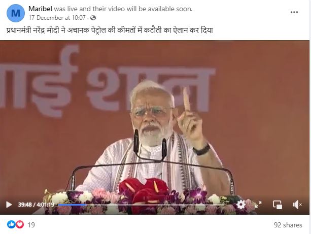 दावे की सत्यता जानने के लिए हमने वायरल वीडियो को पूरा ध्यान से सुना। इसमें पीएम मोदी बुंदेलखंड की जनता को संबोधित करते हुए अपनी बात रख रहे थे। लगभग 40 मिनट के अपने भाषण में पीएम मोदी ने कहीं भी पेट्रोल की कीमतों को लेकर कोई एलान नहीं किया है।
