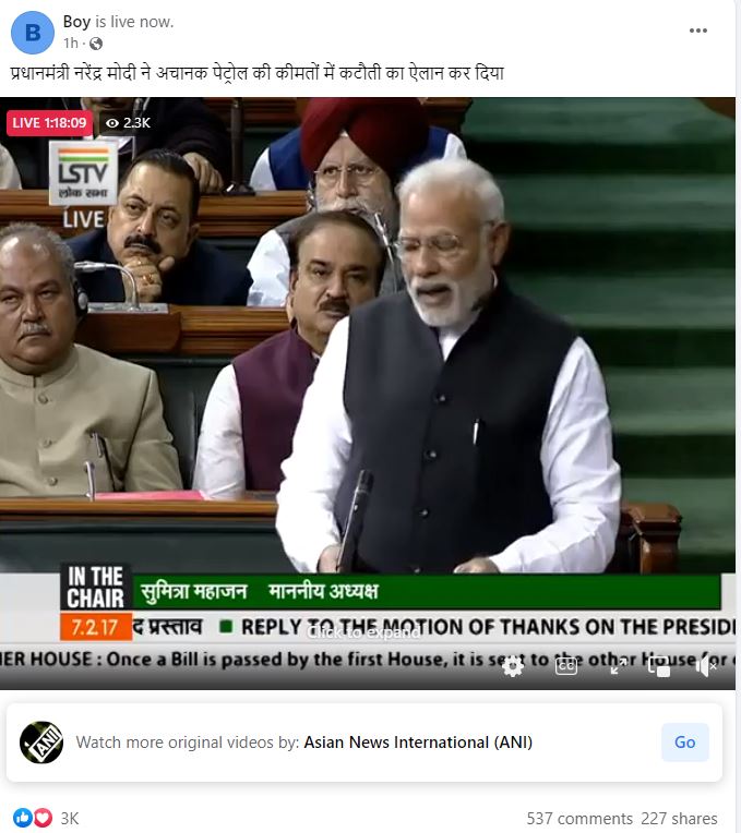 इसके अलावा हमने दूसरे वीडियो की पड़ताल के लिए यूट्यूब पर कुछ कीवर्ड की मदद से सर्च किया। हमें बीजेपी के यूट्यूब चैनल पर पांच साल पुराना वीडियो मिला। फरवरी 2017 में अपलोड किए गए इस वीडियो में राष्ट्रपति के अभिभाषण पर पीएम मोदी संसंद भवन में अपनी बात रख रहे थे। वीडियो में उन्होंने पेट्रोल की कीमतों को कम करने का कोई एलान नहीं किया है।