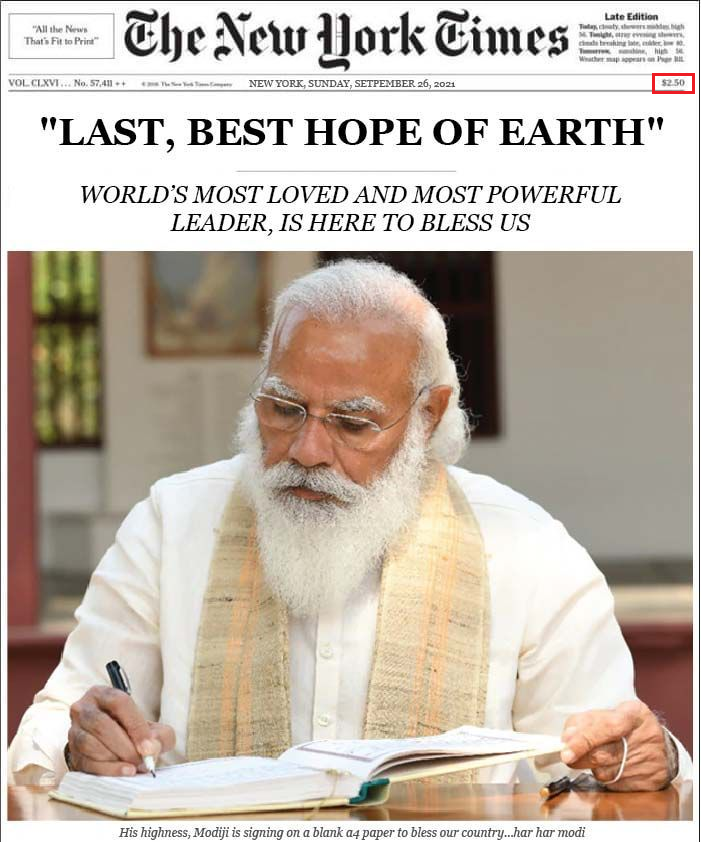 वायरल कतरन का विश्लेषण करने पर हमने यह भी पाया कि इसमें कई व्याकरणीय और संपादकीय गलतियां हैं. उदाहरण के लिए इसमें ‘September’ की वर्तनी ‘Setpember’ लिखी हुई है तथा इसमें प्रधानमंत्री की तस्वीर के नीचे ‘His Highness, Modiji is signing on a blank a4 paper to bless our country… har har Modi’ लिखा हुआ है, जो कि संपादकीय मानकों के विपरीत है. बता दें कि न्यूयॉर्क टाइम्स के एक संस्करण का दाम साल 26 सितंबर, 2021 को छः डॉलर था, ना कि ढाई डॉलर.