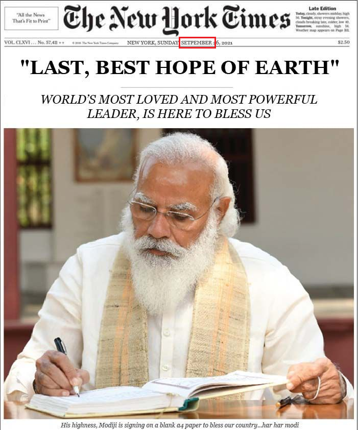सोशल मीडिया तथा मैसेजिंग ऐप्स पर यह दावा किया जा रहा है कि न्यूयॉर्क टाइम्स ने अपने लेख में प्रधानमंत्री नरेंद्र मोदी को दुनिया की आखिरी उम्मीद बताया है.
