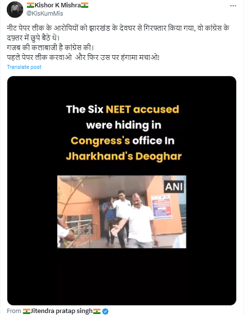 वीडियो को वायरल दावे वाले कैप्शन के साथ शेयर किया गया है, जिसमें यह लिखा हुआ है “नीट पेपर लीक के आरोपियों को झारखंड के देवघर से गिरफ्तार किया गया, वो कांग्रेस के दफ़्तर में छुपे बैठे थे. गजब की कलाबाजी है कांग्रेस की. पहले पेपर लीक करवाओ और फिर उस पर हंगामा मचाओ”.