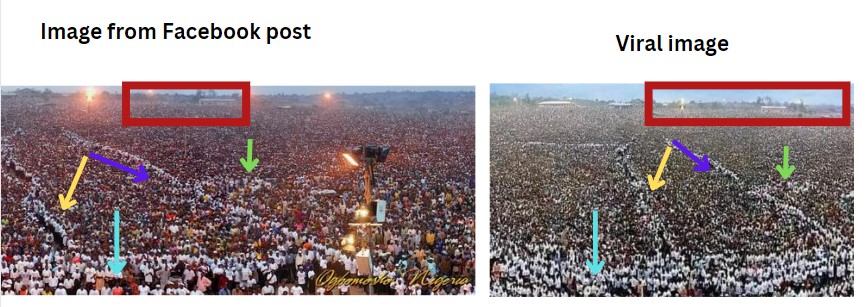 इसके बाद हमने तस्वीर को गूगल पर Reinhard Bonnke कीवर्ड को सर्च किया। हमें Evangelist Reinhard Bonnke – Official Page नामक फेसबुक पेज द्वारा 20 जुलाई 2020 को शेयर किया गया एक पोस्ट मिला। इसमें एक तस्वीर भी है, जिसमें वायरल तस्वीर में मौजूद दृश्य को दूसरे एंगल से देखा जा सकता है। तस्वीर के साथ लिखे गए विवरण के मुताबिक, ये 2002 में नाइजीरिया के Ogbomoso में हुए एक आम सभा का दृश्य है।