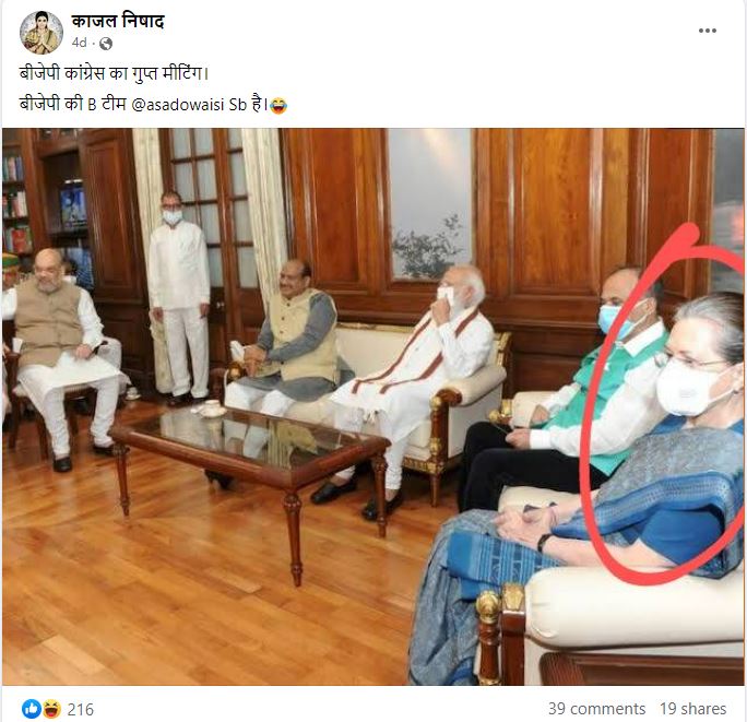 सोशल मीडिया पर एक तस्वीर शेयर कर दावा किया जा रहा है कि बीजेपी और कांग्रेस के बीच गुप्त बैठक हुई है। वायरल तस्वीर में पीएम नरेंद्र मोदी, गृहमंत्री अमित शाह के अलावा कांग्रेस नेता सोनिया गांधी भी नज़र आ रही हैं।