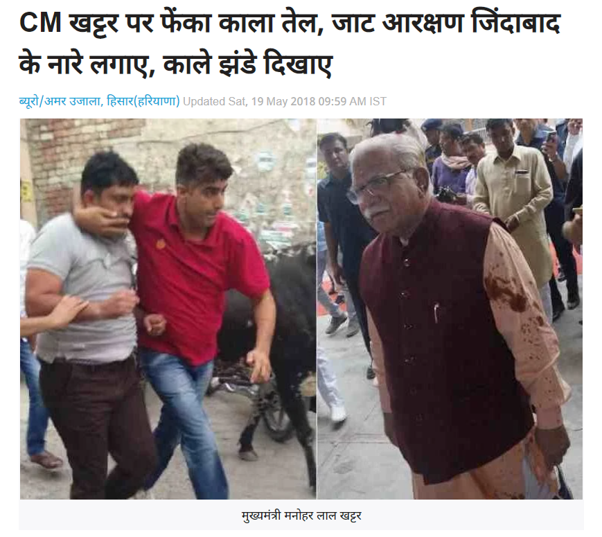 खोज के दौरान हमें अमर उजाला की एक रिपोर्ट मिली। जिसके अनुसार सीएम मनोहर लाल खट्टर की यह वायरल तस्वीर मई 2018 की है, जब हिसार में एक व्यक्ति ने उनपर जाट आरक्षण को लेकर एक रैली के दौरान काला तेल फेंक दिया था।