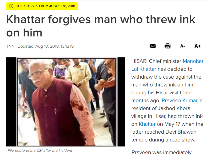 इसके अलावा हमें 18 अगस्त, 2018 को टाइम्स ऑफ इंडिया की वेबसाइट पर वायरल तस्वीर के साथ प्रकाशित एक रिपोर्ट मिली। जिसके मुताबिक हरियाणा के मुख्यमंत्री मनोहर लाल खट्टर ने अपना मामला वापस ले लिया और आरोपी को क्षमा कर दिया था।