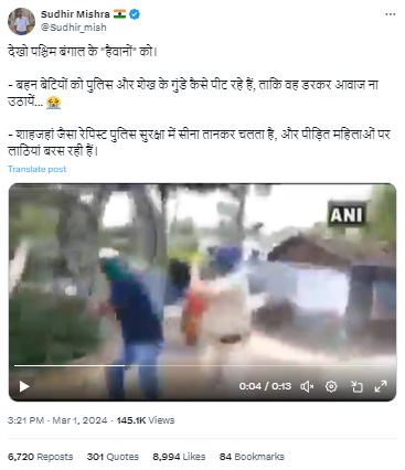 इसी संदर्भ में 1 मार्च 2024 को सुधीर मिश्रा नामक एक वेरीफाइड एक्स (पूर्व में ट्विटर) हैंडल द्वारा एक पोस्ट शेयर किया गया है। पोस्ट में शेयर किये गए 13 सेकंड के वीडियो में एक पुलिसकर्मी द्वारा महिला के साथ हिंसा होती हुई दिख रही है। इस वीडियो के साथ कैप्शन में लिखा है कि ‘देखो पश्चिम बंगाल के “हैवानों” को। बहन बेटियों को पुलिस और शेख के गुंडे कैसे पीट रहे हैं, ताकि वह डरकर आवाज ना उठायें…शाहजहां जैसा रेपिस्ट पुलिस सुरक्षा में सीना तानकर चलता है, और पीड़ित महिलाओं पर लाठियां बरस रही हैं।’