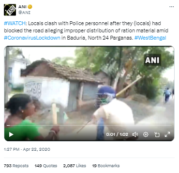 इस दावे की जांच के लिए हमने वीडियो के की-फ्रेम्स को गूगल रिवर्स इमेज सर्च किया। परिणाम में हमें 22 अप्रैल 2020 को ANI द्वारा शेयर किए गए एक्स पोस्ट में वायरल वीडियो का हिस्सा देखने को मिलता है। ANI द्वारा शेयर किए गए 1:02 मिनट के वीडियो के शुरुआती 13 सेकण्ड्स में वायरल वीडियो का हिस्सा देखा जा सकता है। ANI की पोस्ट के कैप्शन में बताया गया है कि यह घटना पश्चिम बंगाल के उत्तर 24 परगना के बदुरिया की है, जहाँ कोरोनोवायरस लॉकडाउन के बीच राशन सामग्री के अनुचित वितरण का आरोप लगाते हुए स्थानीय लोगों ने सड़क को अवरुद्ध कर दिया था, जिसके बाद पुलिसकर्मियों के साथ झड़प हुई और यह वीडियो उसी समय का है।